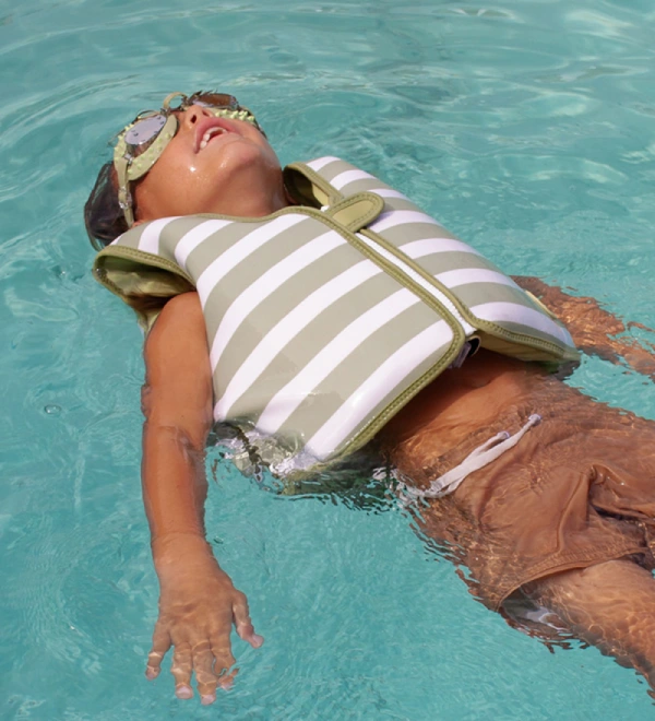 Från paddling till proffs – stärk barnens simförtroende. Into The Wild Swim Vest är söt, praktisk och bekväm och kommer garanterat att göra ett plask var du än går. Tillverkad av hållbart neopren för flytförmåga och värme, dra bara upp västen från framsidan och fäst säkerhetsremmen mellan benen för en snug passform. Små kommer garanterat att älska friheten denna simaccessoar ger dem, från simning till lek och att bygga självförtroende i vattnet. Vänd på huvuden och se till att denna säsong blir minnesvärd med sitt trendiga maxi-randiga mönster, skarpa skalrygg och den coola khaki- och crèmefärgen. Finns i storlekar 2-3 år samt 3-6 år.